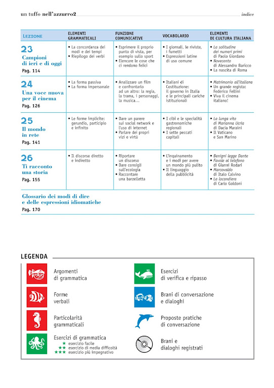 con i compagni di studio. La parte relativa alle funzioni comunicative è evidenziata dall’uso del colore azzurro nella simbologia.